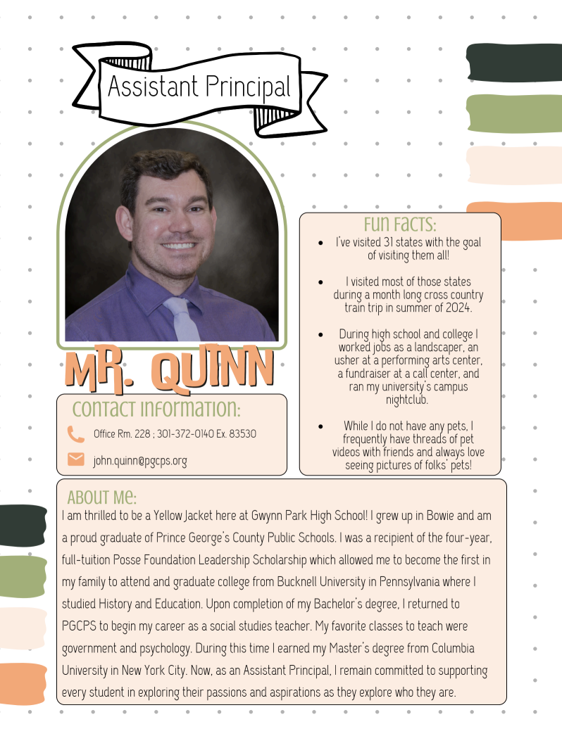 I am thrilled to be a Yellow Jacket here at Gwynn Park High School! I grew up in Bowie and am a proud graduate of Prince George's County Public Schools. I was a recipient of the four-year, full-tuition Posse Foundation Leadership Scholarship which allowed me to become the first in my family to attend and graduate college from Bucknell University in Pennsylvania where I studied History and Education. Upon completion of my Bachelor's degree, I returned to PGCPS to begin my career as a social studies teacher. My favorite classes to teach were government and psychology. During this time I earned my Master's degree from Columbia University in New York City. Now, as an Assistant Principal, I remain committed to supporting every student in exploring their passions and aspirations as they explore who they are.